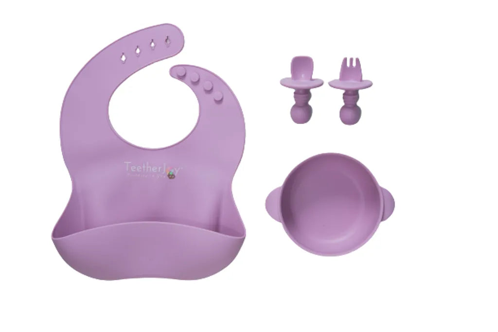 Yay baby is ready for solids! Keep your little one feeling comfy and clean with our pastel collection of silicone baby feeding sets. TeetherJoy's baby feeding set is made from food-grade silicone, BPA, and phthalate-free. Our silicone baby feeding set makes mealtimes much E A S I E R and S T Y L I S H at the same time!