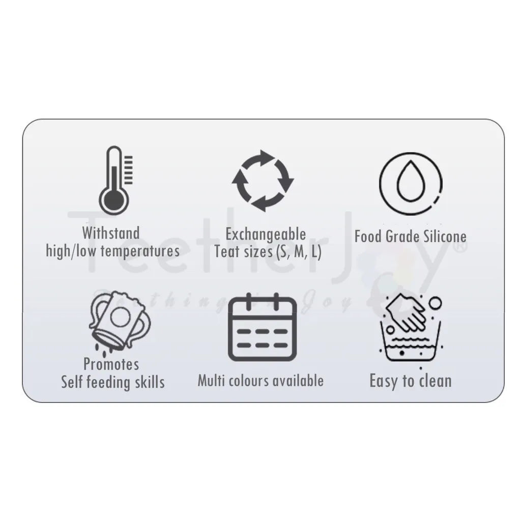 The Joy Feeder is fully made from 100% food-grade silicone, free of BPA, latex, lead, and phthalate. It comes with 3 silicone teats in different sizes (S, M, L) that accompany the growth of your little one. Available in 7 beautiful pastel colors - speckled white, pink, peach, yellow, mint, blue and lilac.